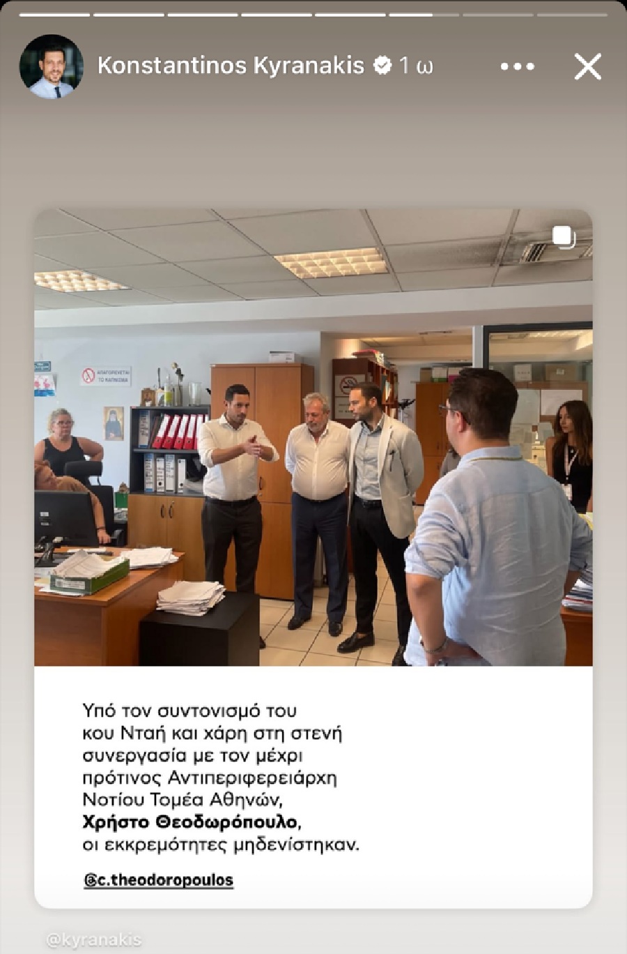 Όπως χαρακτηριστικά ανέφερε ο κ. Κυρανάκης: «Υπό τον συντονισμό του κ. Χρήστου Νταή και χάρη στη στενή συνεργασία με τον μέχρι πρότινος Αντιπεριφερειάρχη Νοτίου Τομέα Αθηνών κ. Χρήστο Θεοδωρόπουλο οι εκκρεμότητες μηδενίστηκαν!»
